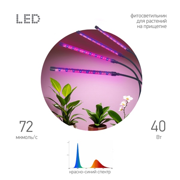 Главное удобство модели — надёжное крепление на прищепке, которое позволяет быстро и легко зафиксировать лампу в нужном положении. Свет равномерно распределяется по поверхности, создавая благоприятную среду для роста растений.