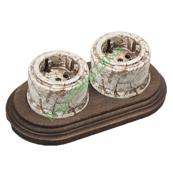 Две керамических электрических ретро розетки с заземлением и деревянной рамкой, накладного исполнения, мрамор/старое дерево, Бирони серия Лизетта. B1-101-09/CD-17