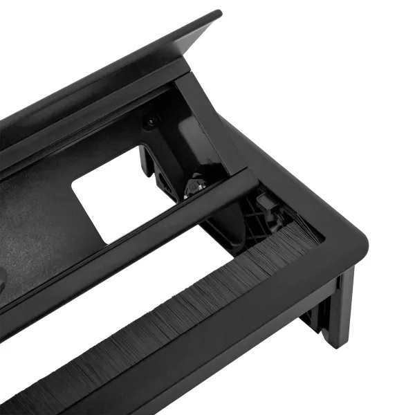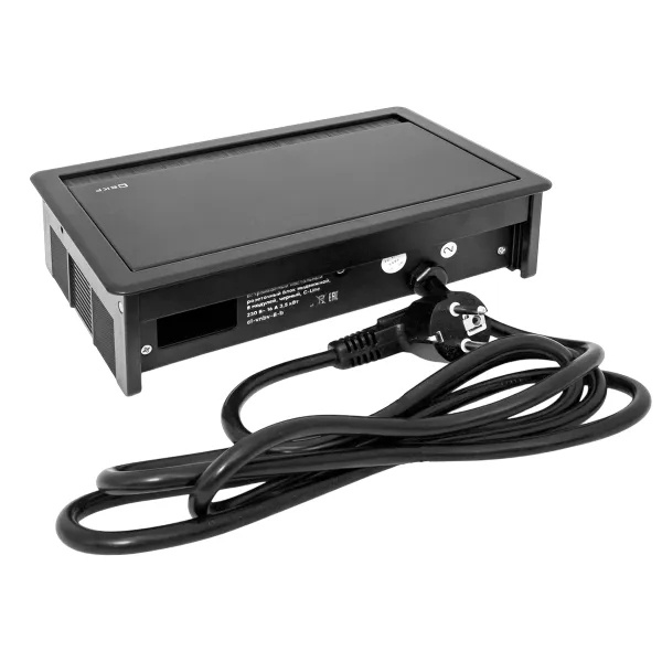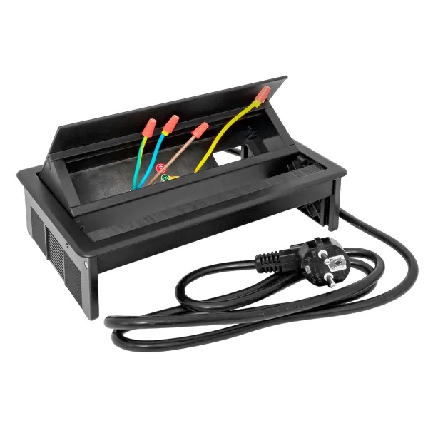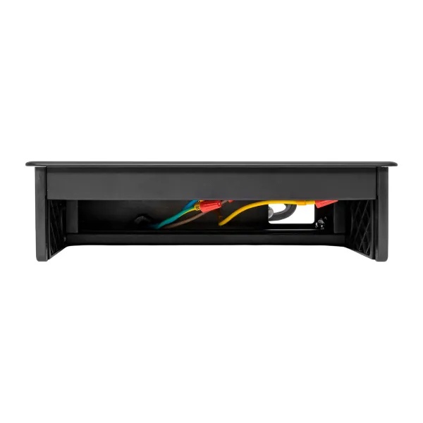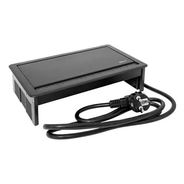 Выдвижной настольный розеточный блок прямоугольной формы с ручным механизмом плавного закрытия, предназначенное для установки модульных ЭУИ. Монтаж производится в предварительно подготовленное отверстие 235х145 мм. Допустимая толщина поверхности стола 10-45 мм.