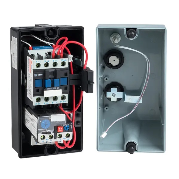 Магнитный пускатель КМЭ серии EKF PROxima представляет собой полностью укомплектованное устройство, включающее малогабаритный контактор КМЭ, тепловое реле РТЭ, корпус с сальниками для ввода кабелей и кнопки управления. Это оборудование предназначено для дистанционного управления запуском и остановкой трехфазных асинхронных электродвигателей с короткозамкнутым ротором при переменном напряжении до 400 В. Пускатели эффективно защищают электродвигатели от длительных перегрузок и сверхтоков, которые могут возникать, например, при обрыве одной из фаз, обеспечивая надежность и безопасность работы оборудования.