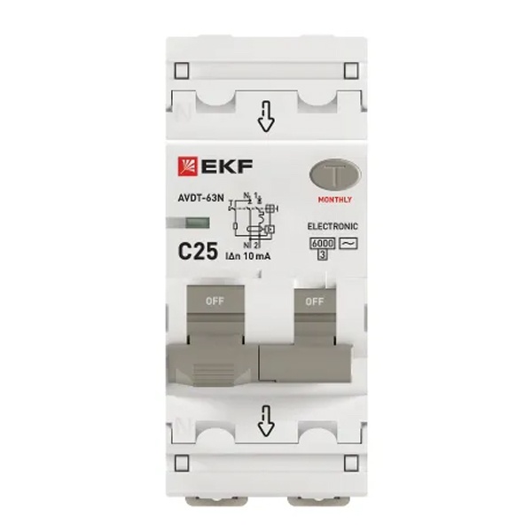 • Дифавтомат EKF PROxima АВДТ-63N 1P+N C25А 10мА тип АС однофазный электронный 6кА (дифференциальный автомат, АВДТ)