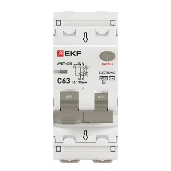 • Дифавтомат EKF PROxima АВДТ-63N 1P+N C63А 30мА тип АС однофазный электронный 6кА (дифференциальный автомат, АВДТ)