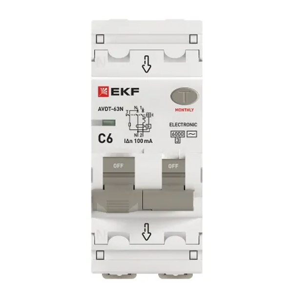 • Дифавтомат EKF PROxima АВДТ-63N 1P+N C6А 100мА тип АС однофазный электронный 6кА (дифференциальный автомат, АВДТ)