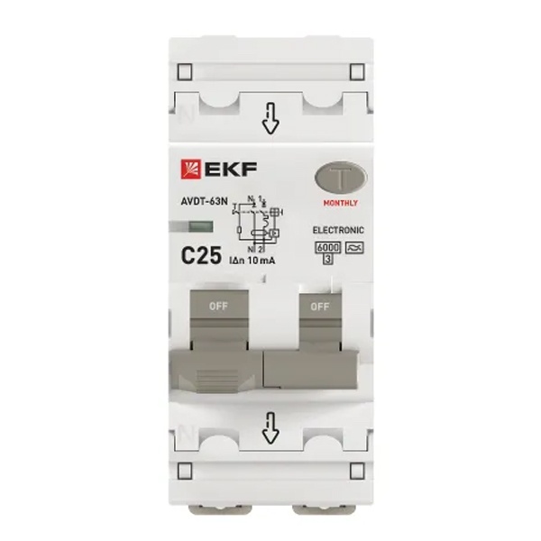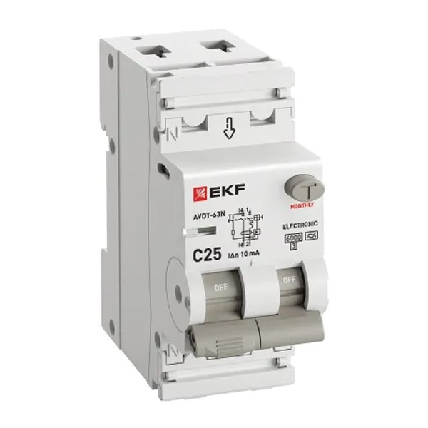 • Дифавтомат EKF PROxima АВДТ-63N 1P+N C25А 10мА тип А однофазный электронный 6кА (дифференциальный автомат, АВДТ)