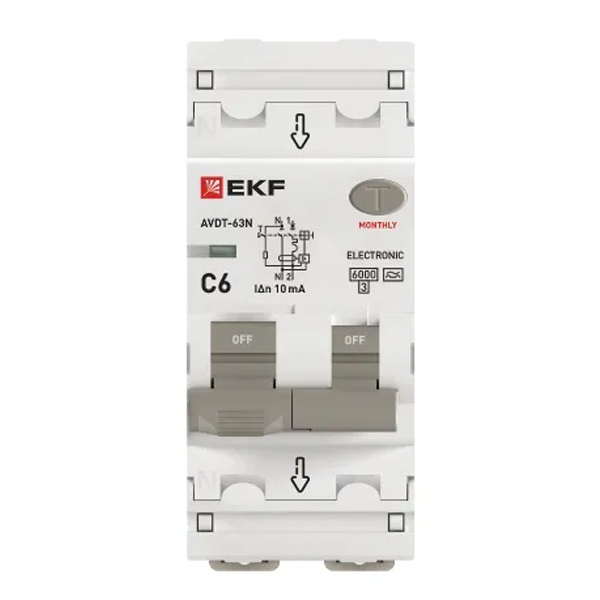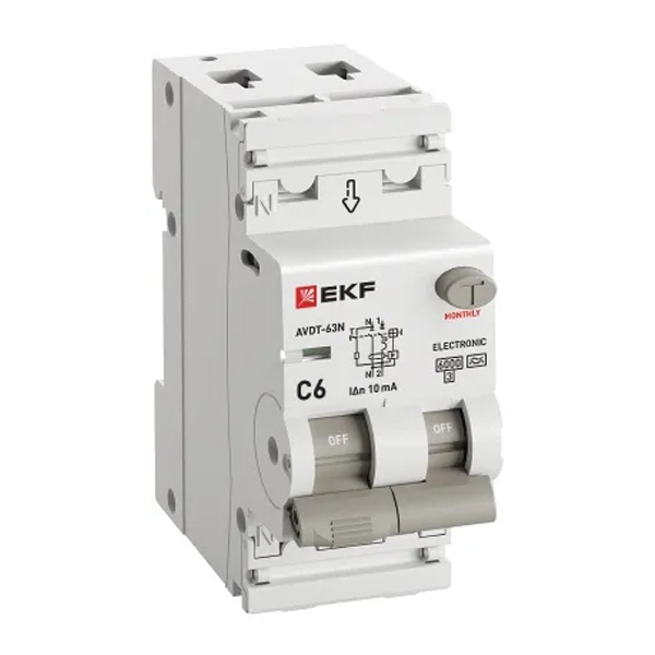 • Дифавтомат EKF PROxima АВДТ-63N 1P+N C6А 10мА тип А однофазный электронный 6кА (дифференциальный автомат, АВДТ)