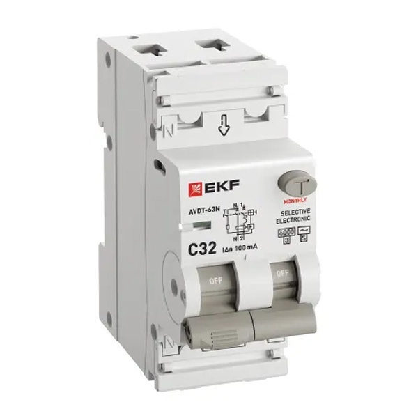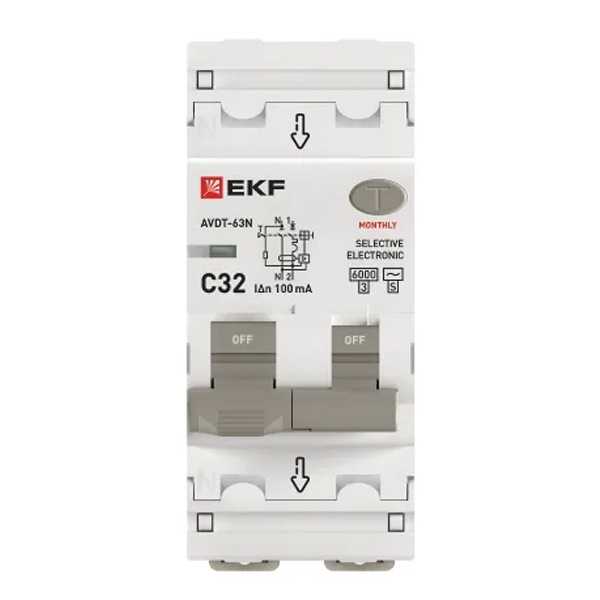 Дифавтомат EKF PROxima АВДТ-63N (S) 1P+N C32А 100мА тип АС однофазный селективный электронный 6кА (дифференциальный автомат, АВДТ)