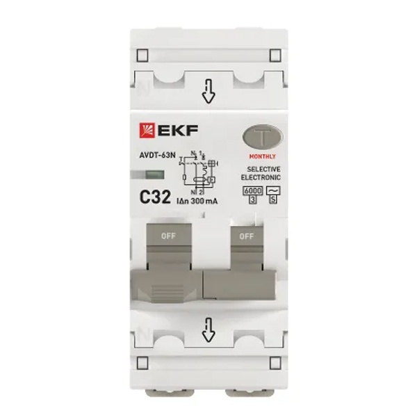 Дифавтомат EKF PROxima АВДТ-63N (S) 1P+N C32А 300мА тип АС однофазный селективный электронный 6кА (дифференциальный автомат, АВДТ)