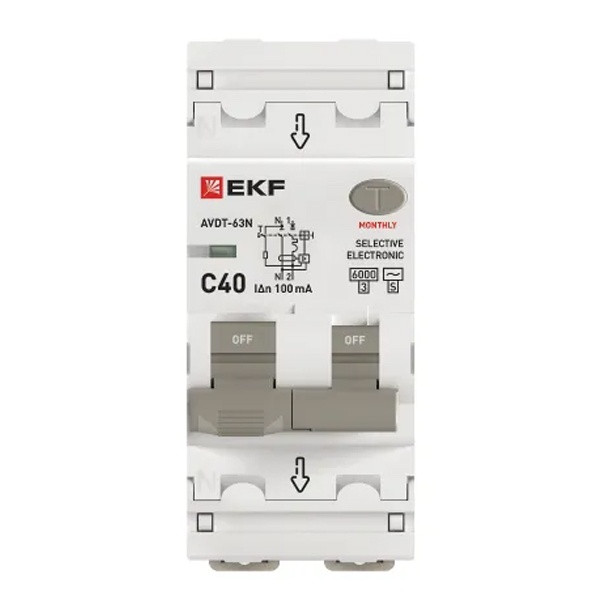 • Дифавтомат EKF PROxima АВДТ-63N (S) 1P+N C40А 100мА тип АС однофазный селективный электронный 6кА (дифференциальный автомат, АВДТ)