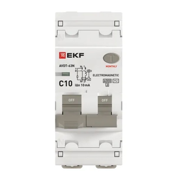 Дифавтомат EKF PROxima АВДТ-63N 1P+N C10А 10мА тип АС однофазный электромеханический 6кА (дифференциальный автомат, АВДТ)