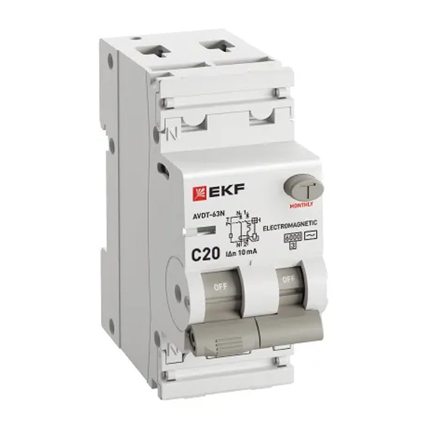 • Дифавтомат EKF PROxima АВДТ-63N 1P+N C20А 10мА тип АС однофазный электромеханический 6кА (дифференциальный автомат, АВДТ)