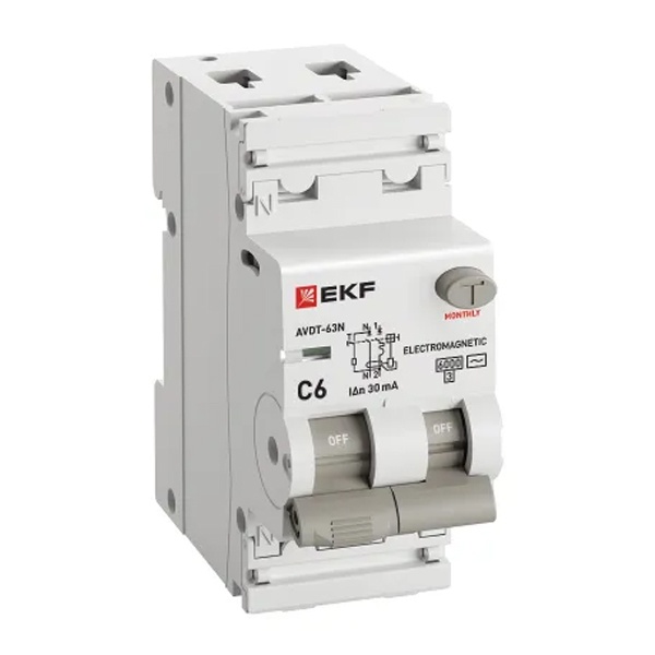 • Дифавтомат EKF PROxima АВДТ-63N 1P+N C6А 30мА тип АС однофазный электромеханический 6кА (дифференциальный автомат, АВДТ)