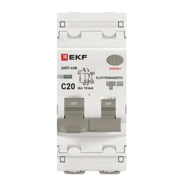 • Дифавтомат EKF PROxima АВДТ-63N 1P+N C20А 10мА тип А однофазный электромеханический 6кА (дифференциальный автомат, АВДТ)
