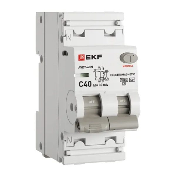 • Дифавтомат EKF PROxima АВДТ-63N 1P+N C40А 30мА тип А однофазный электромеханический 6кА (дифференциальный автомат, АВДТ)