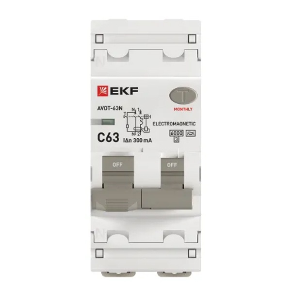 Дифавтомат EKF PROxima АВДТ-63N 1P+N C63А 300мА тип А однофазный электромеханический 6кА (дифференциальный автомат, АВДТ)
