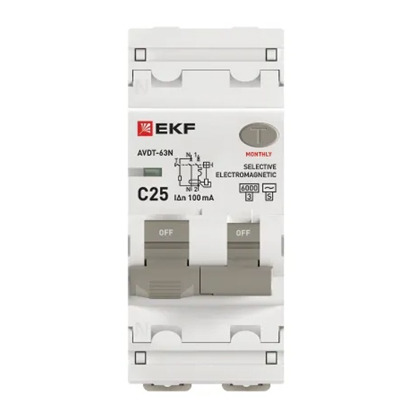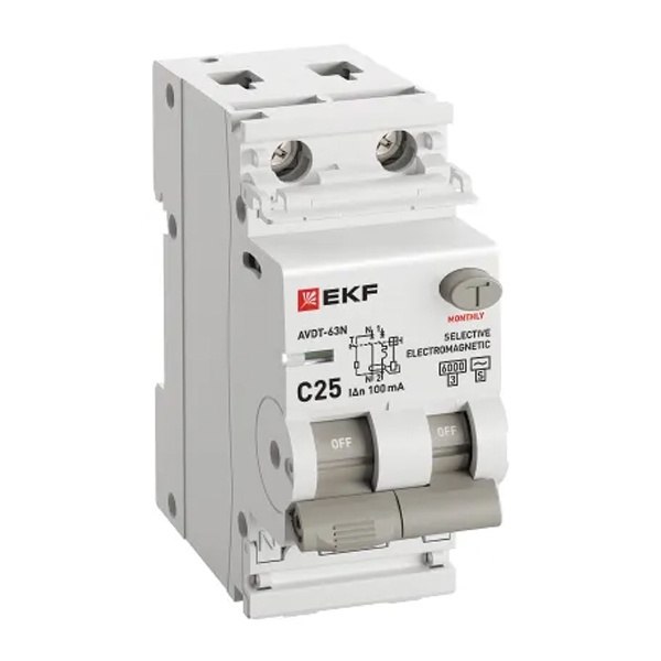 • Дифавтомат EKF PROxima АВДТ-63N (S) 1P+N C25А 100мА тип АС однофазный селективный электромех. 6кА (дифференциальный автомат, АВДТ)