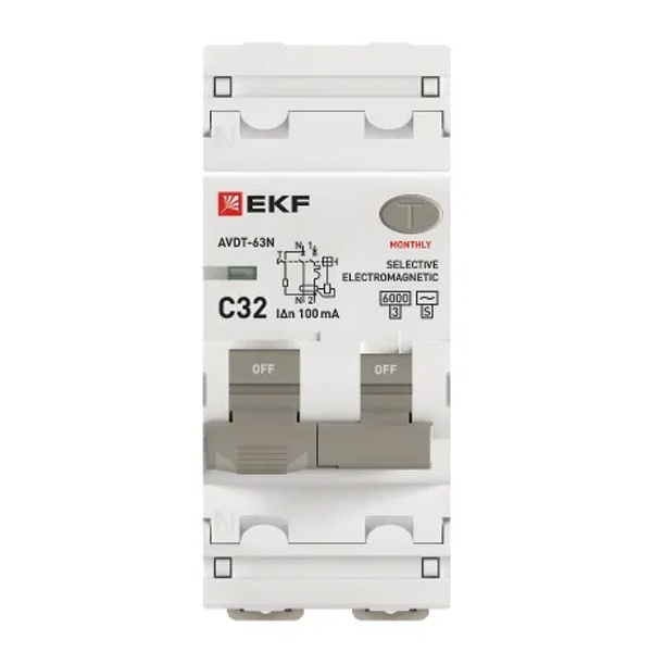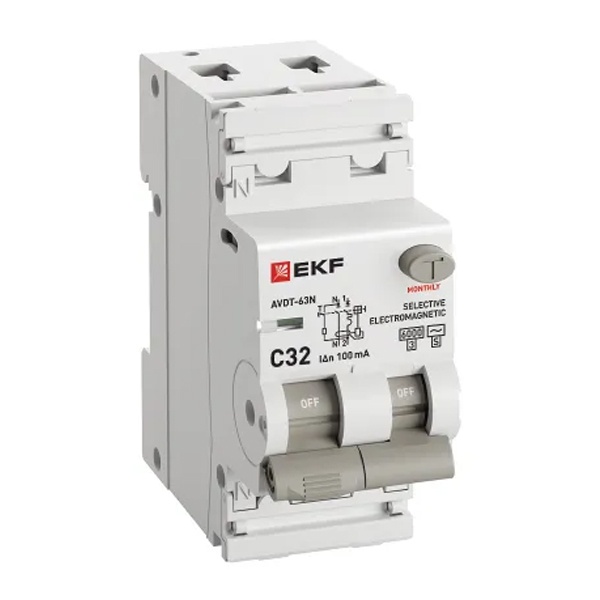 • Дифавтомат EKF PROxima АВДТ-63N (S) 1P+N C32А 100мА тип АС однофазный селективный электромех. 6кА (дифференциальный автомат, АВДТ)