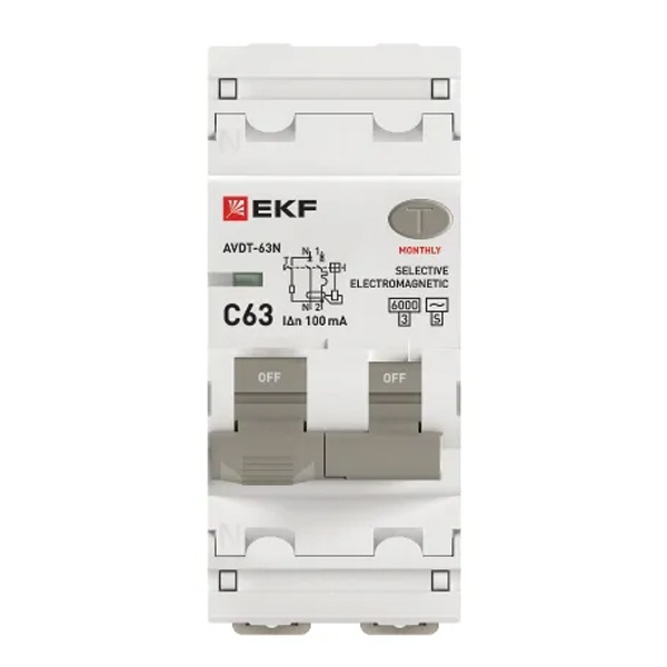 • Дифавтомат EKF PROxima АВДТ-63N (S) 1P+N C63А 100мА тип АС однофазный селективный электромех. 6кА (дифференциальный автомат, АВДТ)