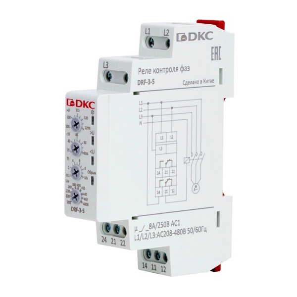 Реле контроля фаз DRF-3-5 предназначено для постоянного мониторинга состояния фаз в трёхфазной электрической сети. Устройство осуществляет контроль наличия всех трёх фаз, их чередования, уровня напряжения и симметрии между фазами. При обнаружении отклонений от нормы — таких как обрыв одной из фаз, неправильное чередование фаз, пониженное или повышенное напряжение, а также недопустимая асимметрия напряжений — реле формирует управляющий сигнал для отключения защищаемого оборудования, предотвращая его повреждение.