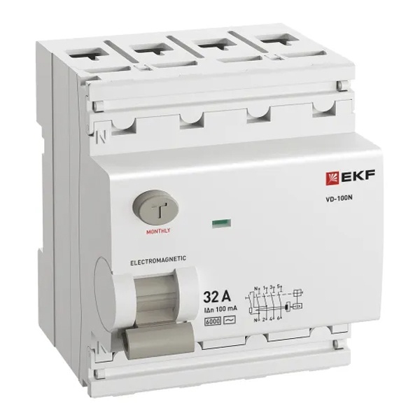 • УЗО EKF PROxima ВД-100N 4П 32А 100мА тип AC 6кА (электромеханическое) (ВДТ)