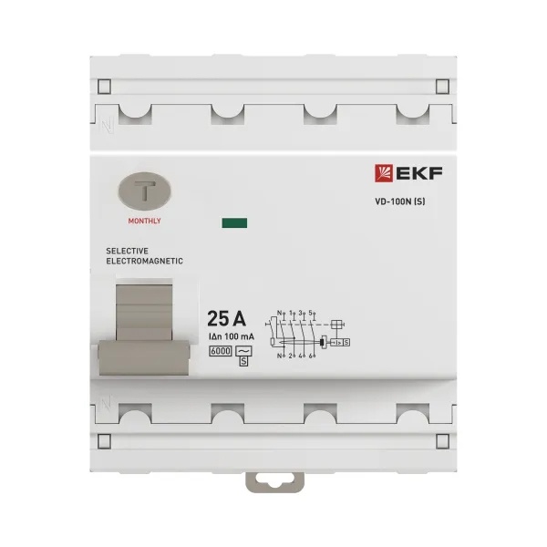 УЗО EKF PROxima ВД-100N (S) 4П 25А 100мА тип AC селективное 6кА (электромеханическое) (ВДТ)
