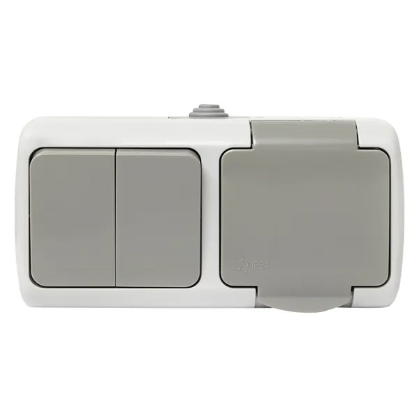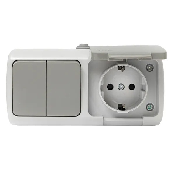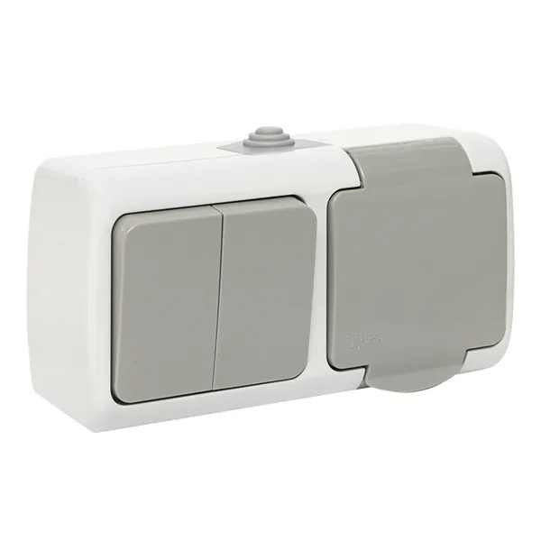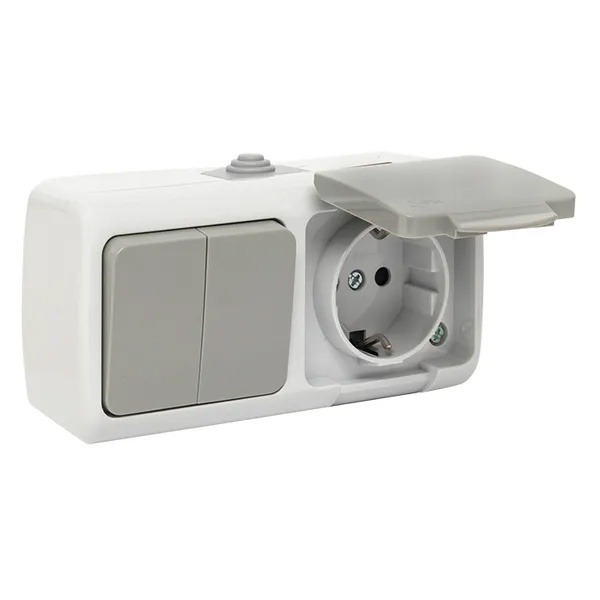 Накладной комбинированный влагозащищенный горизонтальный блок 2-клавишный выключатель и электрическая розетка с заземлением и крышкой ЭКФ Мурманск открытой установки EFRV16-052-30-540