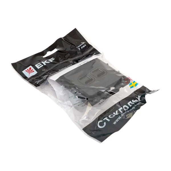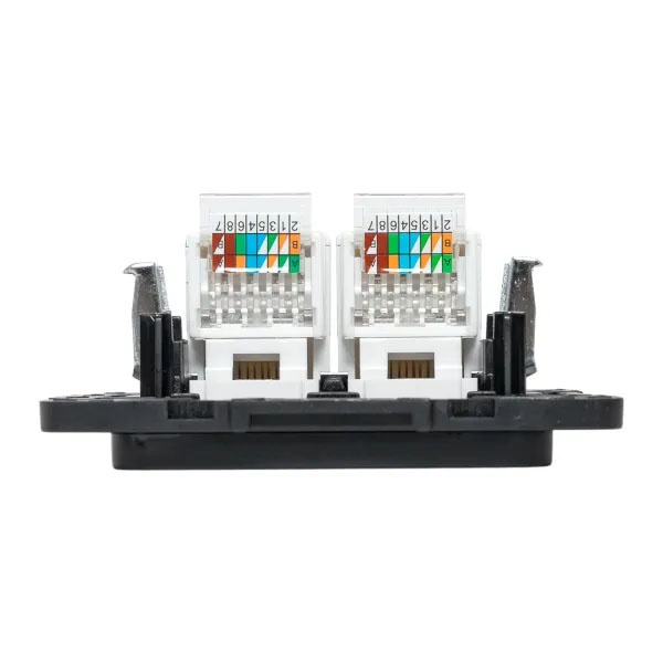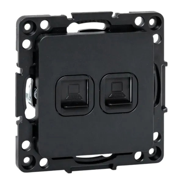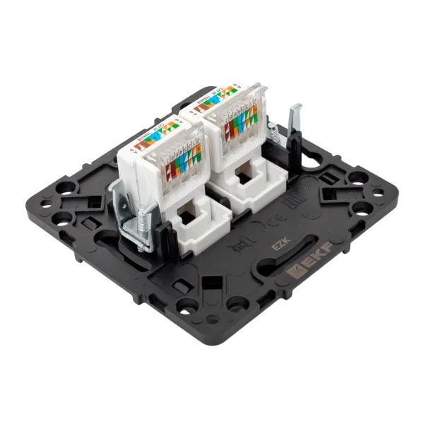 Механизм информационной розетки с двумя разъемами RJ45 для скрытой установки в сухих помещениях с накладкой черного цвета, ЕКФ серии Стокгольм. EZK02-035-10