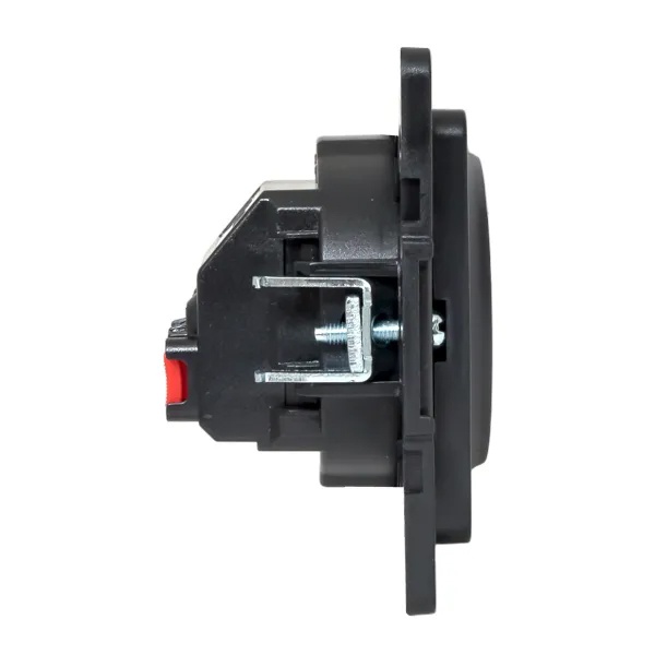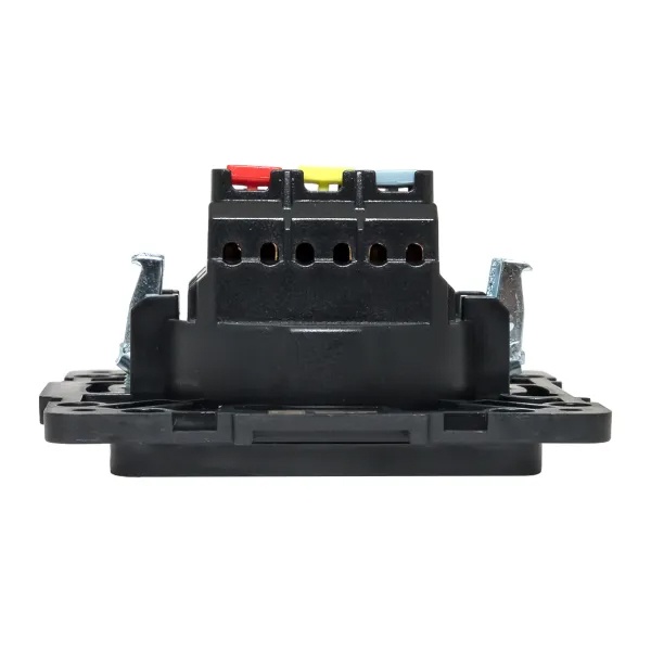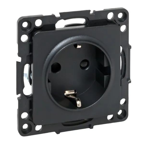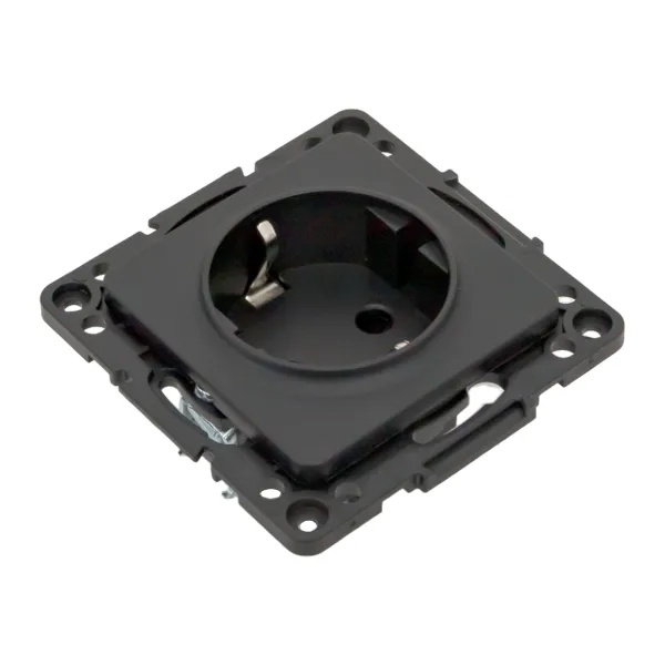 Механизм электрической розетки немецкого стандарта с защитой контактов и пружинным подключением для скрытой установки в сухих помещениях с накладкой черного цвета, ЕКФ серии Стокгольм.