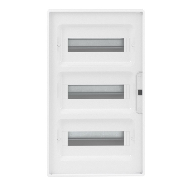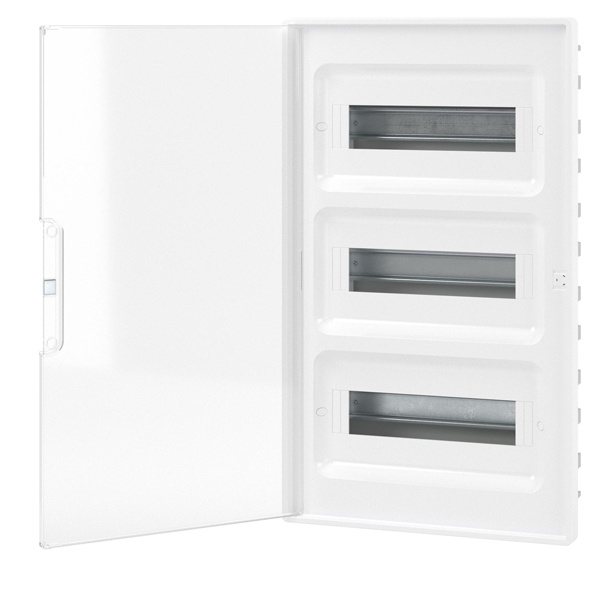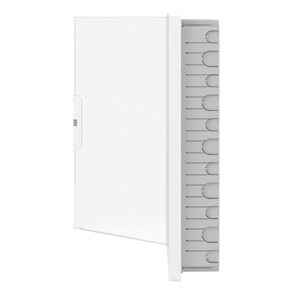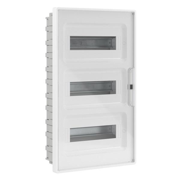Пластиковый распределительный шкаф DKC Frame скрытой установки в спустотелых стенах, три ряда 36 модулей, прозрачная дверь F36B3WT