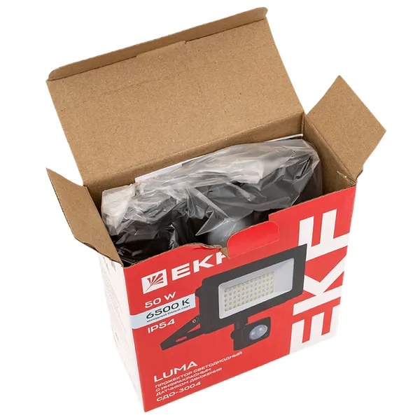 Прожектор светодиодный, с ИК датчиком движения СДО 3004, 50Вт, холодный белый свет (6500 Кельвинов), черный FLL-3004-50D-6500