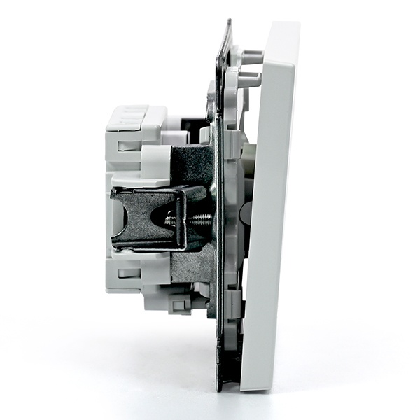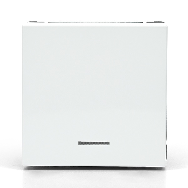 Механизм включения-выключения электроприборов путем нажатия. Кнопочное устройство управления оснащено съемной накладкой белого цвета.