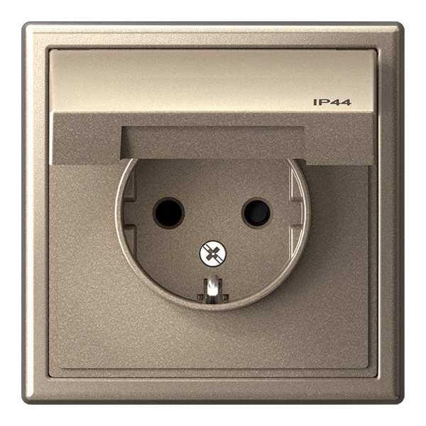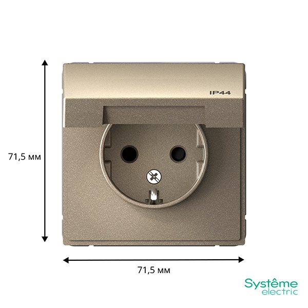 Встраиваемая влагозащищенная электрическая силовая розетка с заземлением и защитными шторками и крышкой АртГеллери цвета шампань Систем Электрик GAL440546