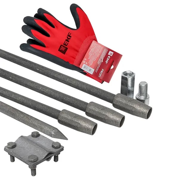 Установка защитного заземления электроустановок и оборудования, а также заземление молниезащиты является обязательным комплексом мер, направленных на обеспечение безопасности. Для этой цели применяется заземляющий комплект от известной компании EKF, который представляет собой штыревую систему с заострением общей длиной 6 метров.Состав набора:- штырь заземления длиной 150 см и диаметром 1.6 см с заострением. Он является первым стержнем, погружаемым в грунт;- 3 штыря заземления длиной 150 см и диаметром 1.6 см с соединением муфта-муфта;- 3 соединительные муфты диаметром 1.6 см, необходимые для крепления штырей между собой, а также для их защиты от механических повреждений;- гайка переходная с внутренней резьбой и диаметром 1.6 см;- ударный винт М16х25 для защиты штыря от ударной нагрузки при монтаже;- зажим: штырь-полоса-прут – представляет собой стальную пластину на 4 болтах, которая обеспечивает соединение штыря с круглыми и плоскими проводниками;- электропроводящая смазка ЭПС-98 объемом 40 г для покрытия созданных соединений.Монтаж заземляющего комплекта не требует проведения земляных работ и может производиться одним человеком с помощью ручного или электрического ударного инструмента. Оцинкованное покрытие изделий обеспечивает им продолжительный срок службы и защищает от коррозии. Штыревая система заземления универсальна и применяется не только снаружи зданий и сооружений, но и в подвальных помещениях.