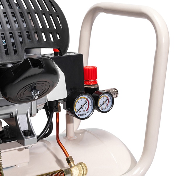 Для дополнительной безопасности предусмотрен термопредохранитель с функцией ручного восстановления, а также механический клапан сброса давления. Контроль давления осуществляется двумя манометрами — на ресивере и на выходе.