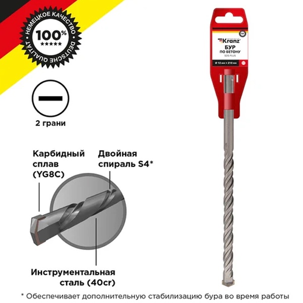 Бур по бетону 12x210 мм SDS PLUS Kranz - режущий инструмент, предназначен для бурения твердых материалов: гранит, бетон, камень. Применяется при выполнении строительных и ремонтных работ, используется для электроинструмента.