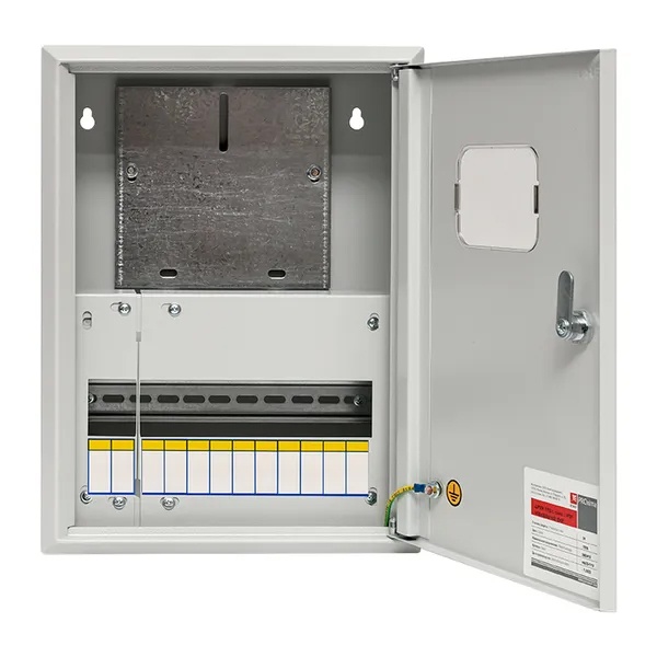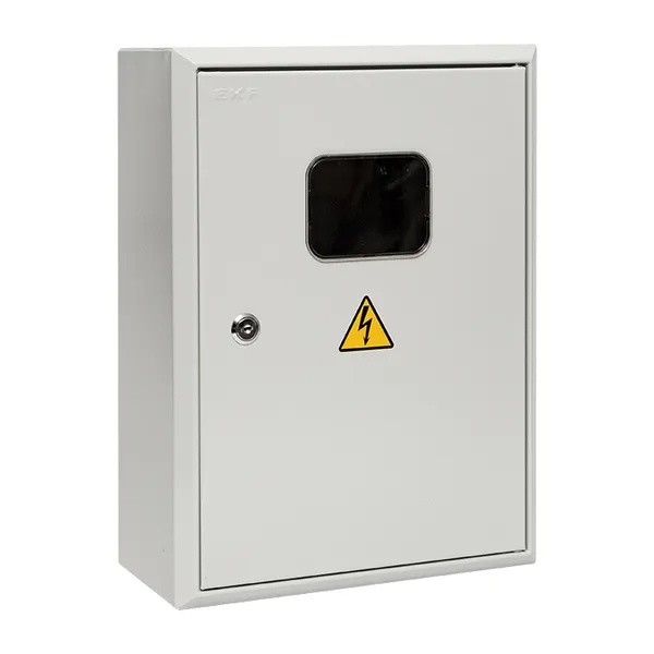 Учетно-распределительный щит наружного типа от производителя EKF серии Basic представляет собой прочный металлокорпус, предназначенный для дальнейшей сборки пунктов ввода, учета и распределения электроэнергии, а также защиты сетей от коротких замыканий или перегрузок. Номинальная нагрузка тока для встраиваемого оборудования может достигать 125 Ампер при напряжении сети 230-400 Вольт. Внутри щита присутствует монтажная панель размером 170х183 мм из стали толщиной 1.2 мм и DIN-рейка для установки модульной аппаратуры в количестве 12 единиц. На панель крепится электросчетчик, показания которого можно снять без доступа во внутреннее пространство корпуса с помощью смотрового окошка, расположенного в двери щита.