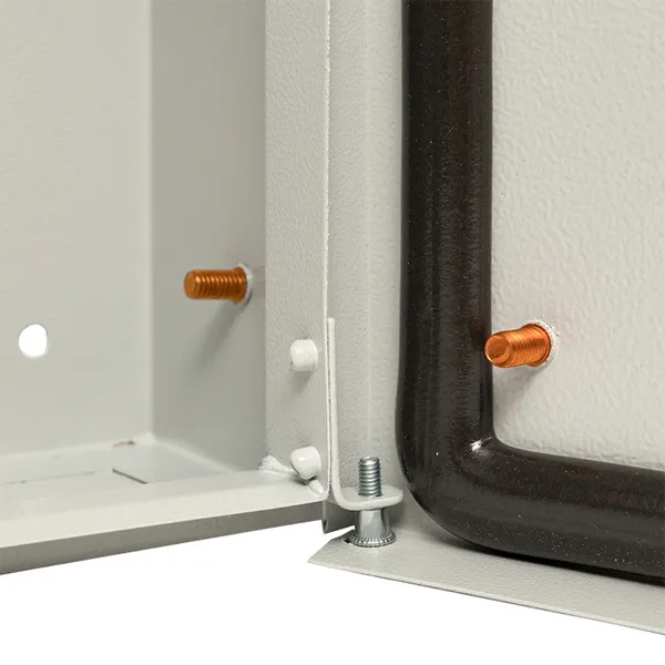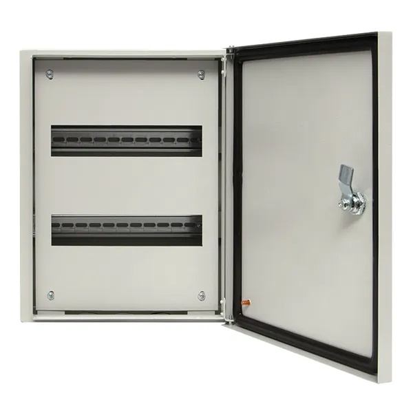 Дверь сплошного типа с углом открывания 120 градусов запирается на замок-треугольник. В комплект поставки входит 2 DIN-рейки, на которые производится установка устройств. Подключение кабеля осуществляется снизу сквозь имеющиеся кабельные вводы. Распределительный щит обладает эргономичным дизайном, удобен и практичен в эксплуатации. Он может размещаться на открытом воздухе под навесом, поэтому отлично подходит для размещения как в жилом, так и промышленном секторе.