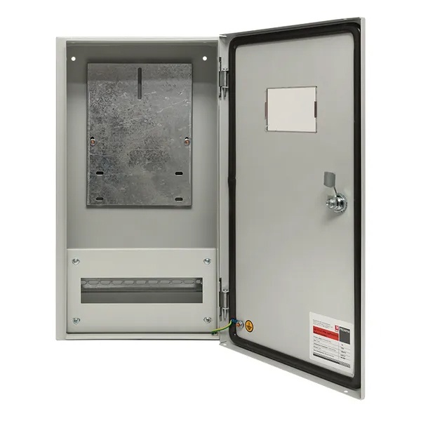 Учетный щит ЩУ серии PROxima от известного производителя EKF представляет собой навесной металлический бокс, предназначенный для ввода и учета электроэнергии. Внутреннее пространство оснащено монтажной панелью 275х208 мм для размещения электрического счетчика с отсеком для модульного оборудования в количестве 12 единиц с номинальной величиной тока до 125 Ампер при напряжении сети 230-400 Вольт. Оболочка электрощита сделана сварным методом из листовой стали толщиной 1.2 мм и обеспечивает жесткость и герметичное соединение частей. Степень защиты IP54 предотвращает попадание пыли и влаги внутрь корпуса. Для обеспечения дополнительной защиты шкаф оснащен сплошной дверью с углом открывания 120 градусов, запирающейся на замок и имеющей по внутреннему периметру герметичный уплотнитель.