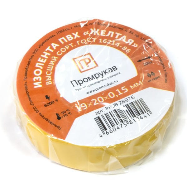 PR08.28785 Изолента ПВХ Промрукав желтая 0,15 x 19 мм х 20 м (8 шт/уп)