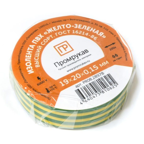 PR08.28786 Изолента ПВХ Промрукав желто-зеленая 0,15 x 19 мм х 20 м (8 шт/уп)