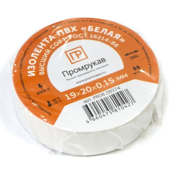 PR08.28974 Изолента ПВХ Промрукав белая 0,15 x 19 мм х 20 м