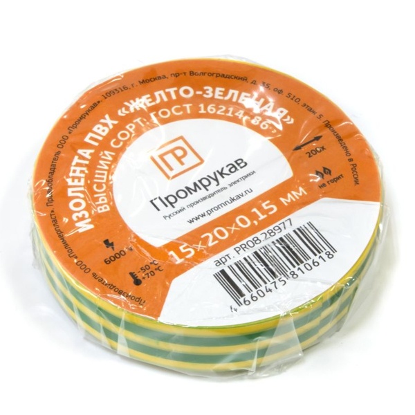 PR08.28977 Изолента ПВХ Промрукав желто-зеленая 0,15 x 15 мм х 20 м