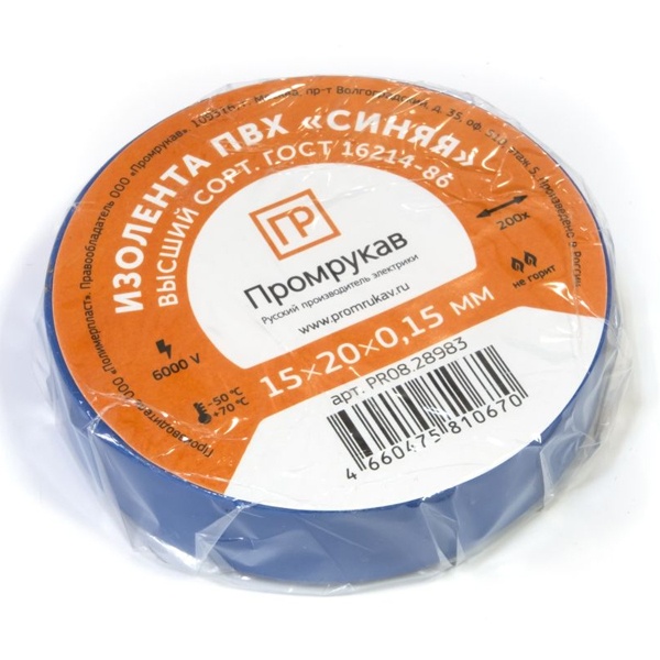 PR08.28983 Изолента ПВХ Промрукав синяя 0,15 x 15 мм х 20 м