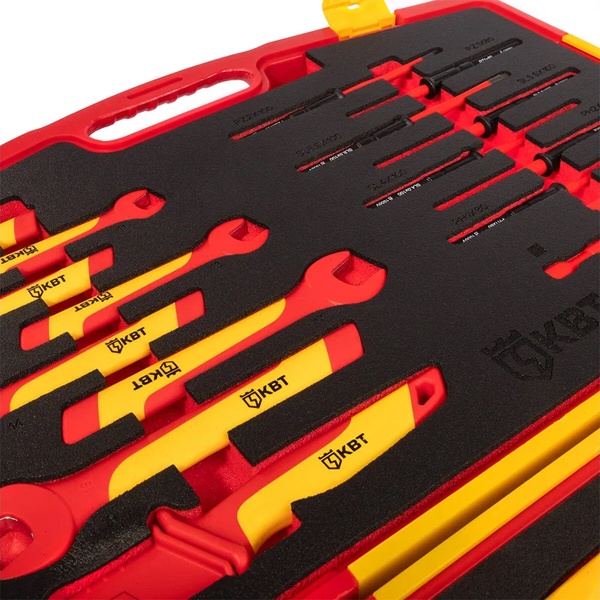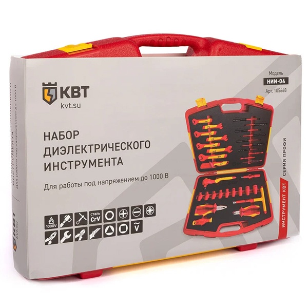 Комплект: Головки диэлектрические с внутренним шестигранником: 10, 11, 12, 13, 14, 17, 19, 22, 24 мм Ключи рожковые диэлектрические: 10, 11, 12, 13, 14, 17, 19 мм Ключ трещотка диэлектрический 250 мм Т-образный диэлектрический ключ 200 мм Удлинитель диэлектрический 125 мм Нож диэлектрический с прямым лезвием Пассатижи диэлектрические 180 мм Бокорезы диэлектрические 160 мм Рукоятка для сменных диэлектрических стержней Сменные диэлектрические стержни: SL4.0х100, 5.5х100, 6.5х100, PH1х80, PH2х100, PZ1х80, PZ2х100 Тестер напряжения 110–250 В Ключи для электрошкафов: треугольный профиль 9 мм, квадратный профиль 8 мм