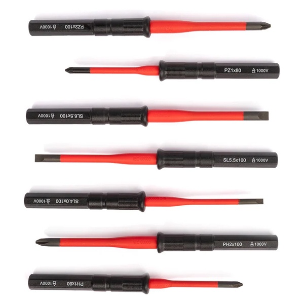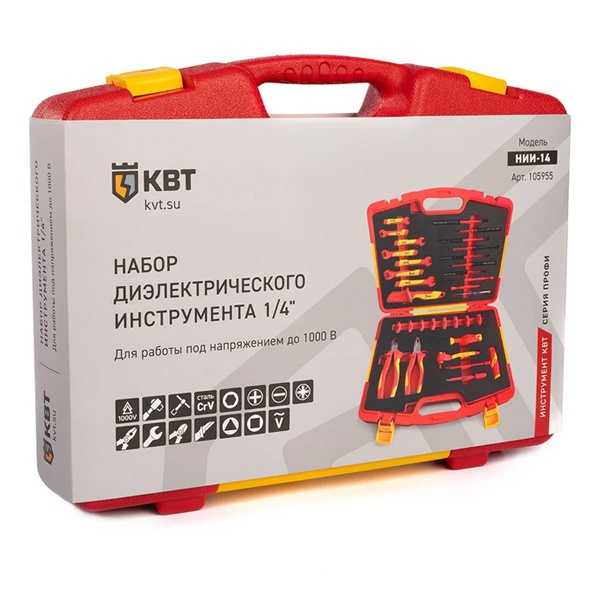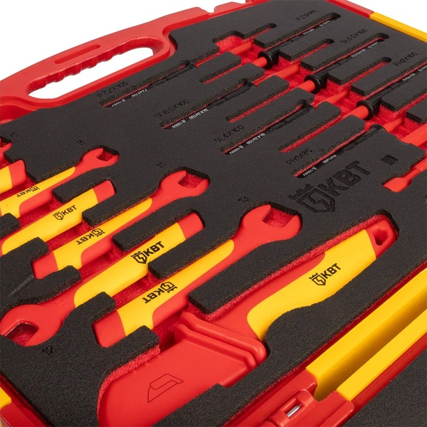 Комплект: Головки диэлектрические с внутренним шестигранником: 5.5, 6, 7, 8, 10, 11, 12, 13 мм Ключи рожковые диэлектрические: 6, 7, 8, 10, 11, 12, 13 мм Ключ трещотка диэлектрический 150 мм Т-образный диэлектрический ключ 160 мм Удлинитель диэлектрический 100 мм Нож диэлектрический с прямым лезвием Пассатижи диэлектрические 160 мм Бокорезы диэлектрические 160 мм Рукоятка для сменных диэлектрических стержней Сменные диэлектрические стержни: SL4.0х100, 5.5х100, 6.5х100, PH1х80, PH2х100, PZ1х80, PZ2х100 Тестер напряжения 110–250 В Ключи для электрошкафов: треугольный профиль 9 мм, квадратный профиль 8 мм