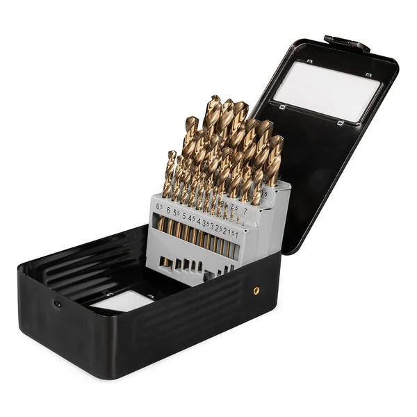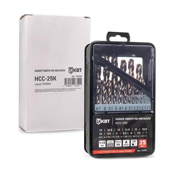 • Набор сверл КВТ по металлу НСС-25К Профи 25 шт. сталь М35 (Р6М5К5) Кобальт и Молибден, 1-13 мм
