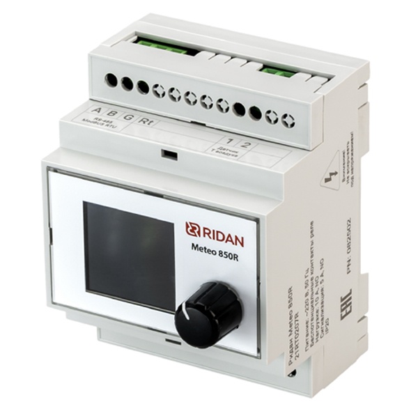 Программируемая метеостанция для управления кабельными системами снеготаяния, для установки на профиль DIN 21RT0207R Ридан Meteo 850R — программируемая метеостанция, предназначена для управления кабельными системами снеготаяния, установленными на кровле. Позволяет контролировать температуру окружающей среды и наличие атмосферных осадков, включать систему кабельного обогрева в автоматическом режиме. Система Ридан Meteo 850R состоит из терморегулятора с датчиком температуры воздуха в комплекте и датчика кровли Ридан Roof 850R. Устанавливается на профиль DIN.