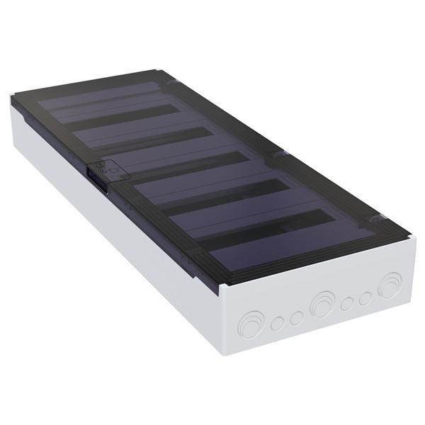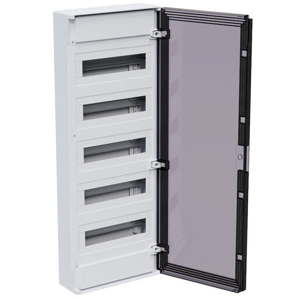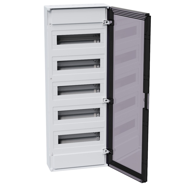 Накладной пластиковый распределительный шкаф 5 рядов на 60 модулей с черной дверью 379813 Корпуса предназначены для удобной и безопасной установки модульных устройств на DIN-рейку. В ассортименте представлены как настенные, так и встраиваемые исполнения, что позволяет использовать их в самых разных условиях - от жилых помещений до промышленных объектов.