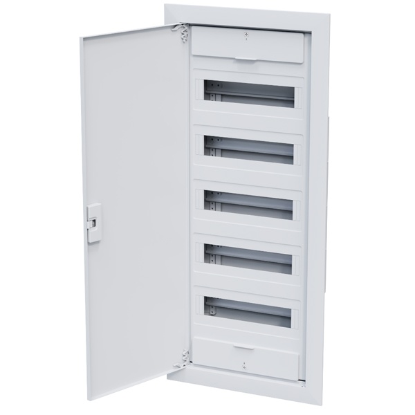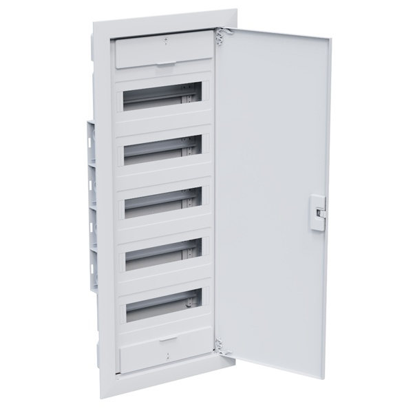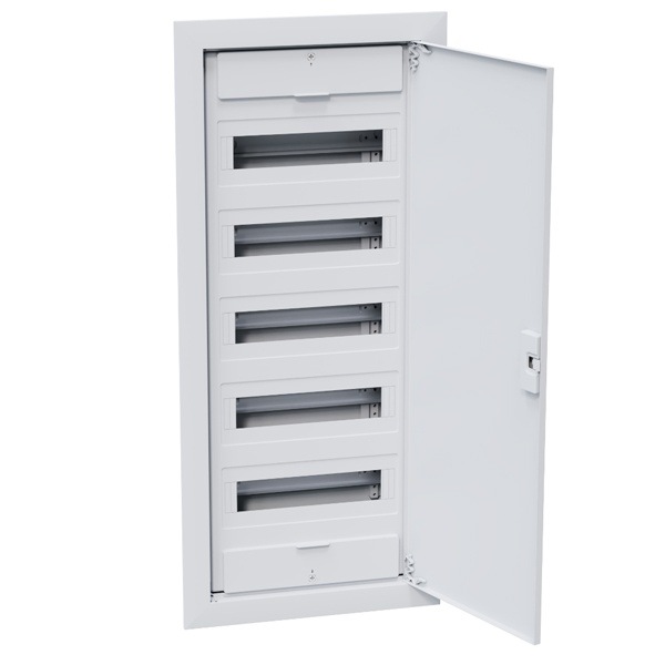 Пластиковый распределительный шкаф 5 рядов на 60 модулей скрытой установки с белой дверью 379814 Корпуса предназначены для удобной и безопасной установки модульных устройств на DIN-рейку. В ассортименте представлены как настенные, так и встраиваемые исполнения, что позволяет использовать их в самых разных условиях - от жилых помещений до промышленных объектов.