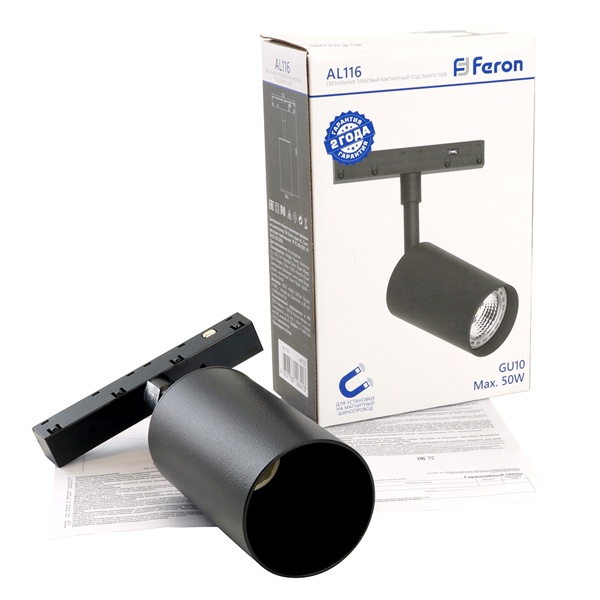 Трековый светильник Ферон AL116, для ламп MR16 с цоколем GU10, максимальной мощностью 15 Вт, черный цвет 48725 Трековые светильники AL116 от Feron предназначены для использования с лампами формата MR16 с цоколем GU10, что обеспечивает широкий выбор источников света с различной цветовой температурой и мощностью.
