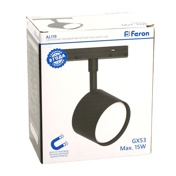 Трековый светильник Ферон AL119, для ламп GX53, максимальной мощностью 15 Вт, черный цвет 48727 Трековые светильники AL119 Ферон разработаны для работы с лампами GX53 и идеально подходят для создания эффектного акцентного освещения в интерьере. Они позволяют точно регулировать направление светового потока, выделяя отдельные элементы декора или зоны помещения.